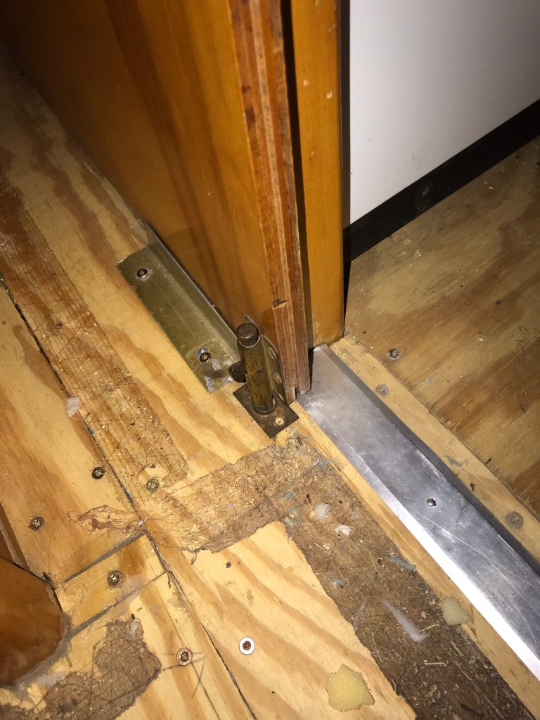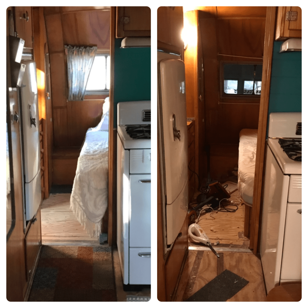 Someone installed new subfloor years ago but never did new flooring. I would have removed the original flooring first I think but it’s what I have to work with. I discovered there is a latch for the sliding door but the luan installer failed to drill the hole for the latch. A few minutes with my drill and the slot for the latch was finally deep enough for it to seat properly. No more stuffing the doorway with my down comforter to keep the door open! Hopefully, this will also lessen visitor urges to slide the door back and forth when giving tours. Tip – don’t feel obligated to test every drawer and cabinet when you visit a vintage trailer.
