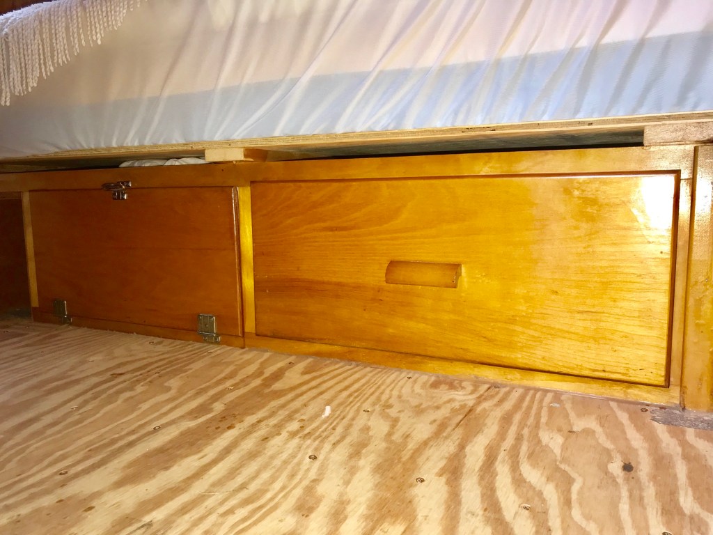 First off there was a cabinet that was sticking. I removed the latch and determined that it was bent. I used a metal clamp to bend it back so it was back to the original 90 d and it’s working now. Still a little sticky but I can get into the underbed storage. I can put a giant down comforter in that cabinet on the left.