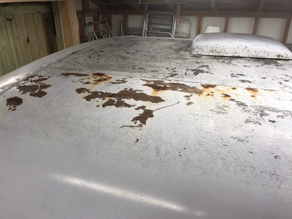 I finally got the Vagabond in the garage and was able to get up on the big ladder and see the roof. There is some rust especially in the front on the driver side. I think I’ll sand it down and stabilize it as best I can. Until I see how successful we will be with trimming the bushes on the driveway I don’t want to put any money in a fancy paint job. It may never be a path that is completely scratch proof. I’m taking out a tree myself so it’s not all on my neighbor.