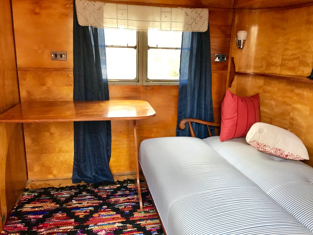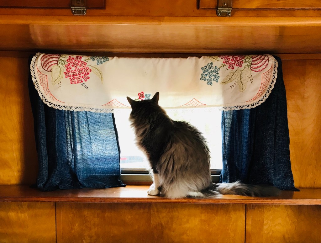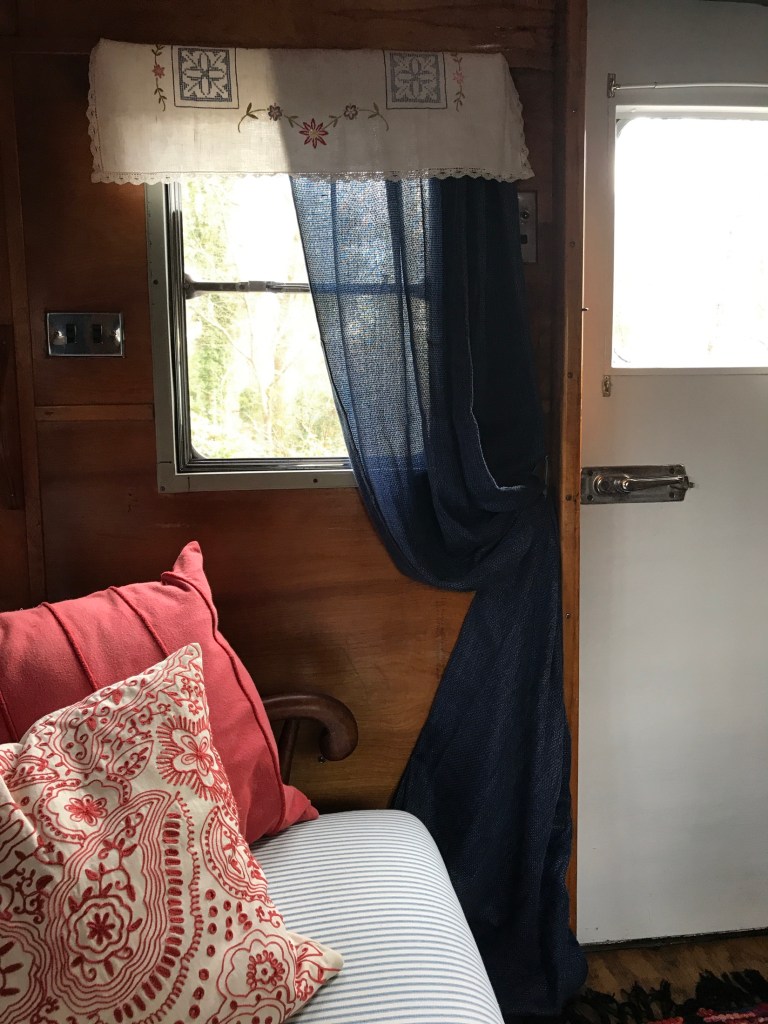The sofa was recently upholstered in navy/white ticking fabric so that necessitated another shift in decorating. I had scheduled our first camping trip with a regional vintage camping group so I was under the gun to get her decorated and usable. I found some curtains at big lots of all places and used my collection of vintage embroidered table runners as valances. The pillows are reruns from my home as is the rug. I’ll probably switch things up as I source vintage items over time. I’m still thinking about blinds but I want to visit some rallies and see them in action before I make that expensive decision. The curtain rods extend far enough that I might be able to have both, or curtains and roller blinds which is a possibility.