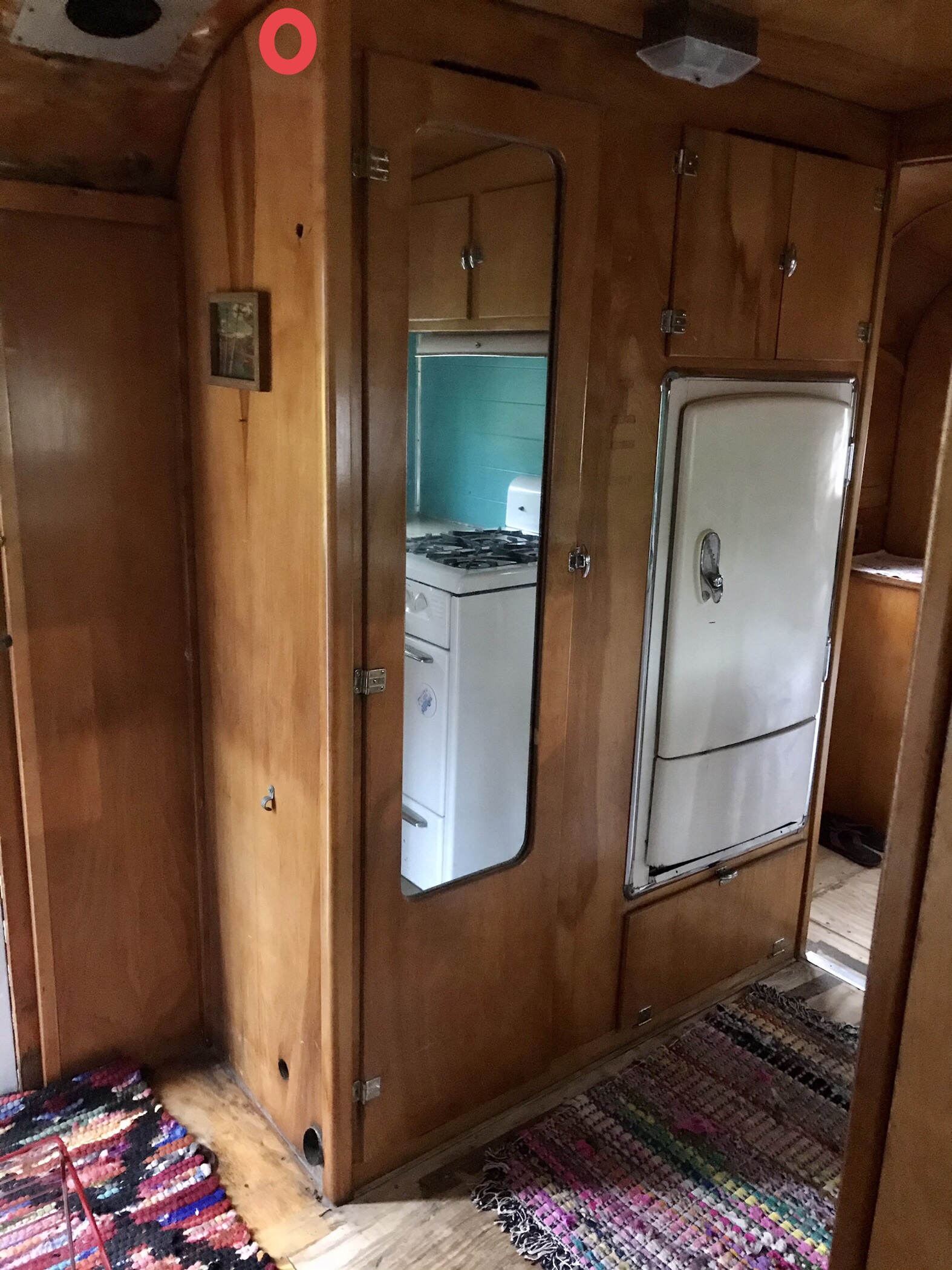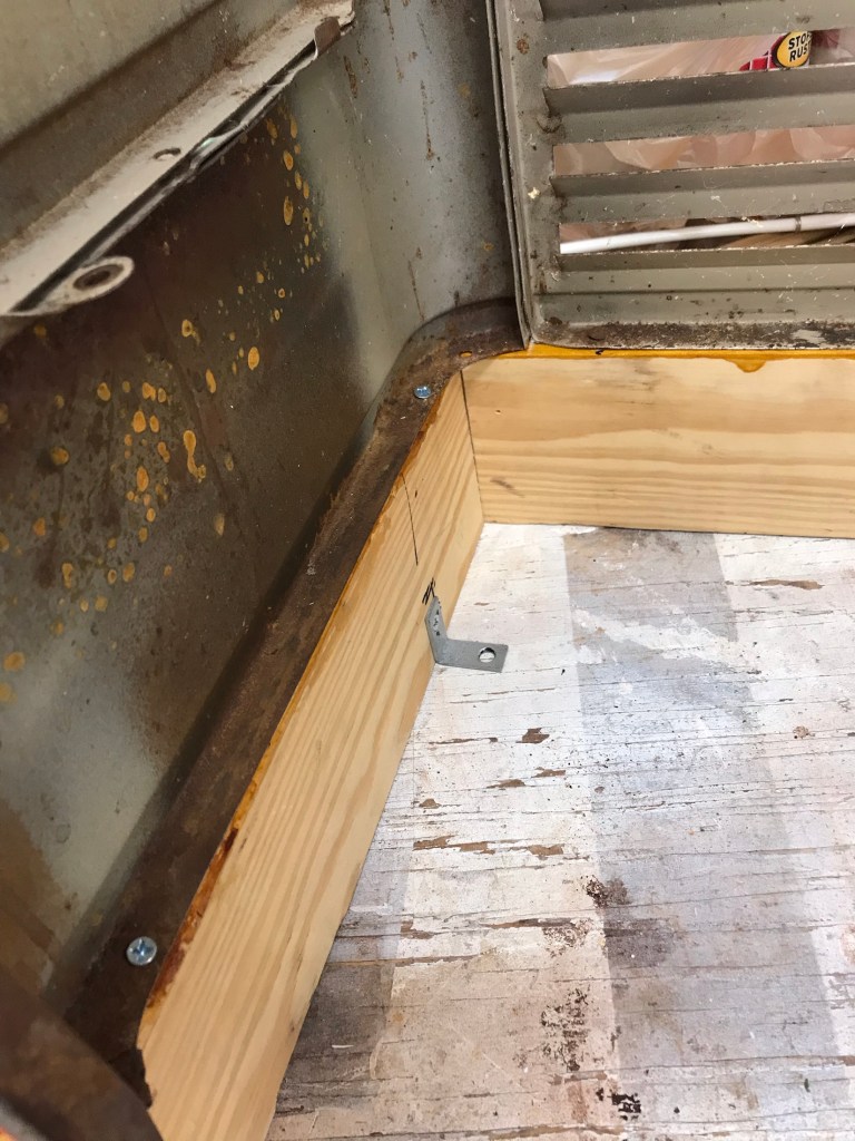 Originally, I planned to duct the cooled air to the bedroom and the living room but my brother who is a professional HVAC person discouraged me from ducting the air. He felt it would be stressful for the unit. So, plan B would be to let the cooled air shoot right out the top through the grill in the top of the Duotherm housing. Next, the exhaust and intake needed to be addressed. I planned to do that through the floor in the closet. That sounds easy but the metal framing under that closet was tight – I had to drill a lot of test holes to mark where I was. Eventually, I was able to drill the holes necessary to fit the ducts. I screwed the fitting that would normally have vented to the outside of a home to the floor of the Vagabond and added some screen gutter guards to discourage critters. I wish I had gotten ductwork with a flange on the top so they would be easy to nail to the floor. It was difficult to drill the large holes – that plywood was dense! By far the most stressful part of the thing was cutting the side of the cabinet. I’m strongly against “damaging” trailers with renovations. But, I needed air here in the sweltering South and I would have been putting the Duotherm in that spot anyway for aesthetics so the hole would not show. I crossed my toes and took to it with my 1980s Craftsman sabre saw. I think I procrastinated on that for about 6 months haha.