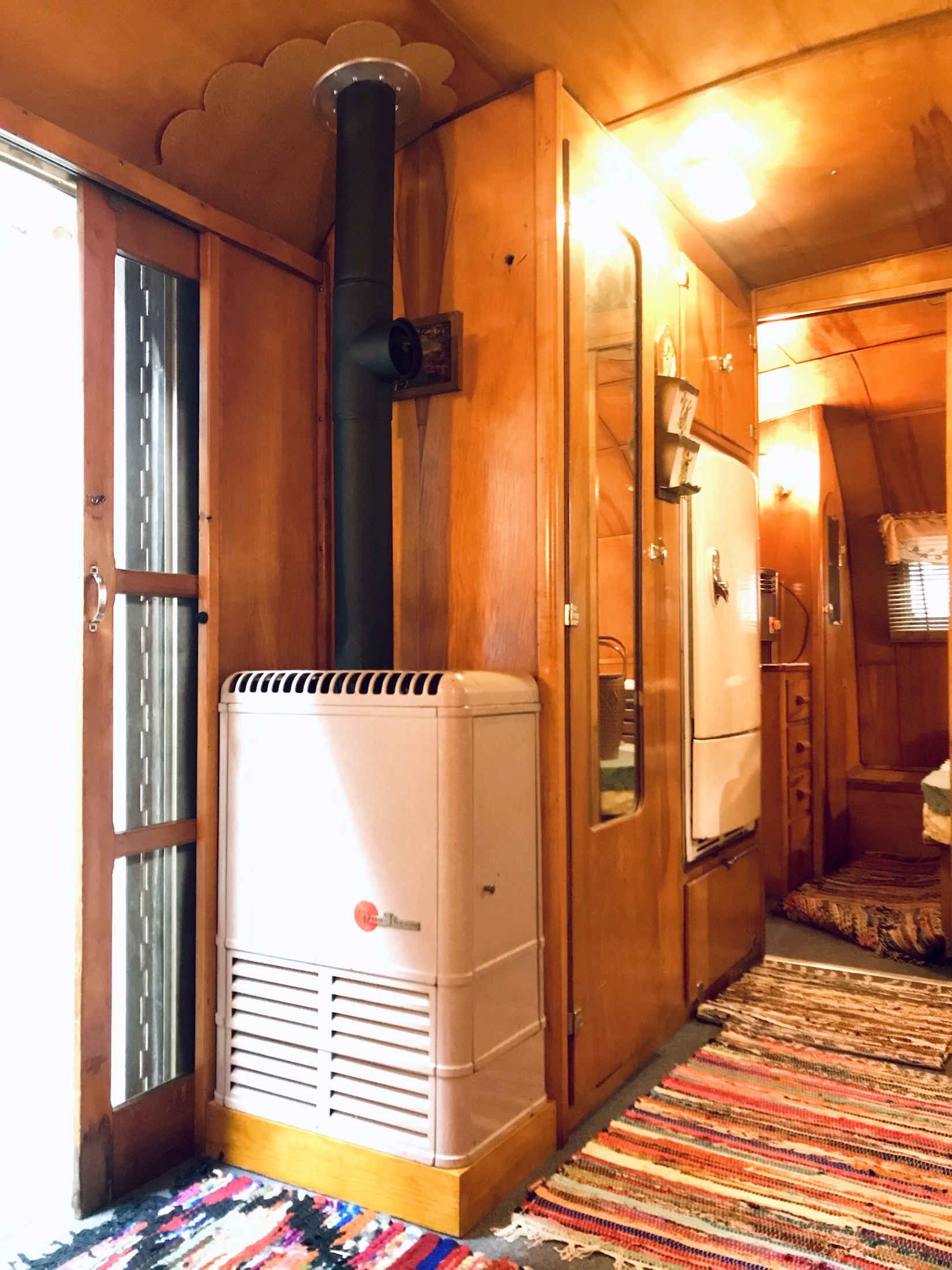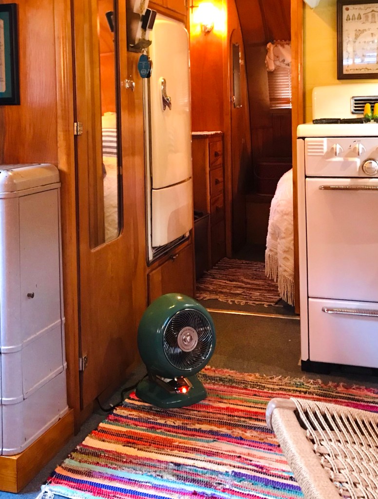 When I sold my 53 Holly, the buyer was willing to let me keep the Duotherm for a fee. I knew where it would go as the Vagabond had a similar unit originally, but the logistics of the ac installation were constantly changing. I planned to use the Duotherm housing to hide an upright portable HVAC unit. I’m not the first person to use a heater housing to hide HVAC or other amenities, but it’s the kind of thing you can’t exactly look up on youtube. You just have to wing it! To start, I measured repeatedly and built test boxes of cardboard before ordering the unit that seemed best suited. None of the units I could find that were slim enough were also short enough to fit in the housing. But, if it was on a wood riser (as it was in the Holly originally) then it would work. I made the riser a little taller than it had to be in case this HVAC dies and another model is needed that might not fit.