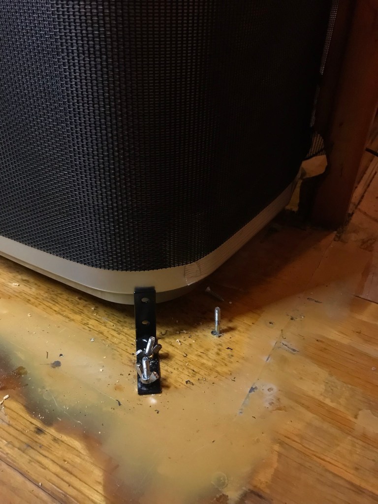 The next challenge was how to keep the “portable” HVAC from rolling around? I did not have means to build any sort of metal enclosure. Eventually I decided to simply address forward and rearward movement separately. Rearward movement is controlled by some large L brackets attached to the floor. Forward movement is controlled by smaller brackets and “lassoing” the unit with heavy duty pet netting attached to the opening via wing nuts and Hanger bolts. It’s my hope that lots of attachments would spread the load and keep things in place. It seems to be working and is easily removed for servicing as its all screwed in place with wing nuts. It’s placed so the filter can be pulled and cleaned without removing the unit. The permanent drain is attached. I also run the fan for a long time after using the AC to be sure the unit is dry. Though this unit has heat, its necessary to cover one of the vents to use it. That is one of those things I wish I had addressed before installation as it’s not practical to remove the hoses on the go. So for now I prefer to use a retro style Vornado space heater.