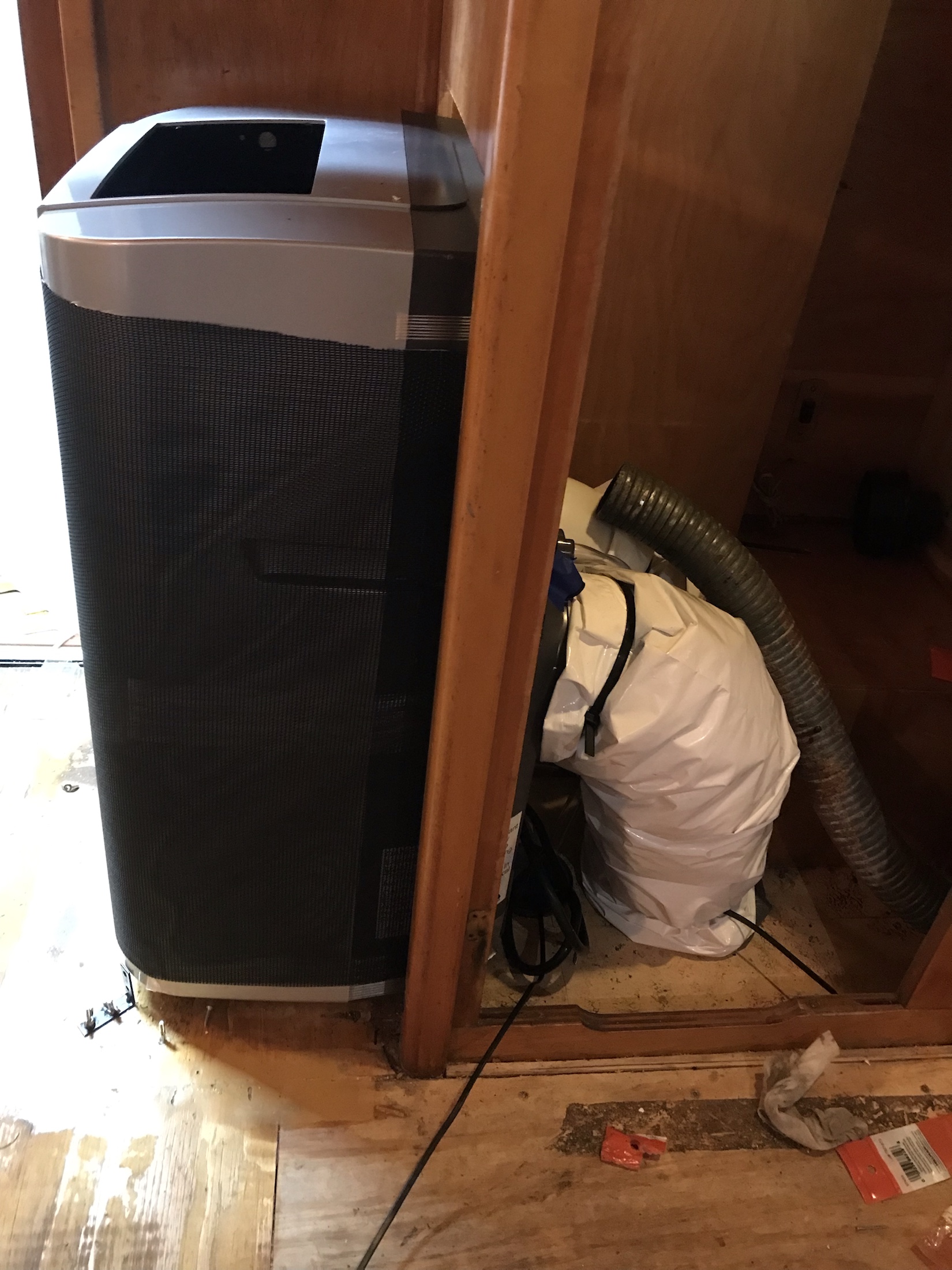 On to the wood riser – on this part I would make some changes next time. Like I said, I’m not a woodworker but I built this riser out of some scrap pine thinking it was a test run. It had to be open on the back for the HVAC to stick thru, so it was kind of hard to make it solid. Also, due to changes in the floor it had to lean back just a little. One side was wedged up against wall, the other I put another hanger bolt in the floor and an L bracket on the riser to go down over the hanger bolt. It worked well, but one day I’d like to redo it with the birch that I cut out of the cabinet. Also, the nail at the edge nearest the closet is backing out so I need to solve that issue. I should have done the hanger bolt/L bracket thing for that end of the riser as well so it could not move. Another solution would be to have a slim piece of wood on the bottom of the riser that the hvac would sit on and would also hold the sides together.