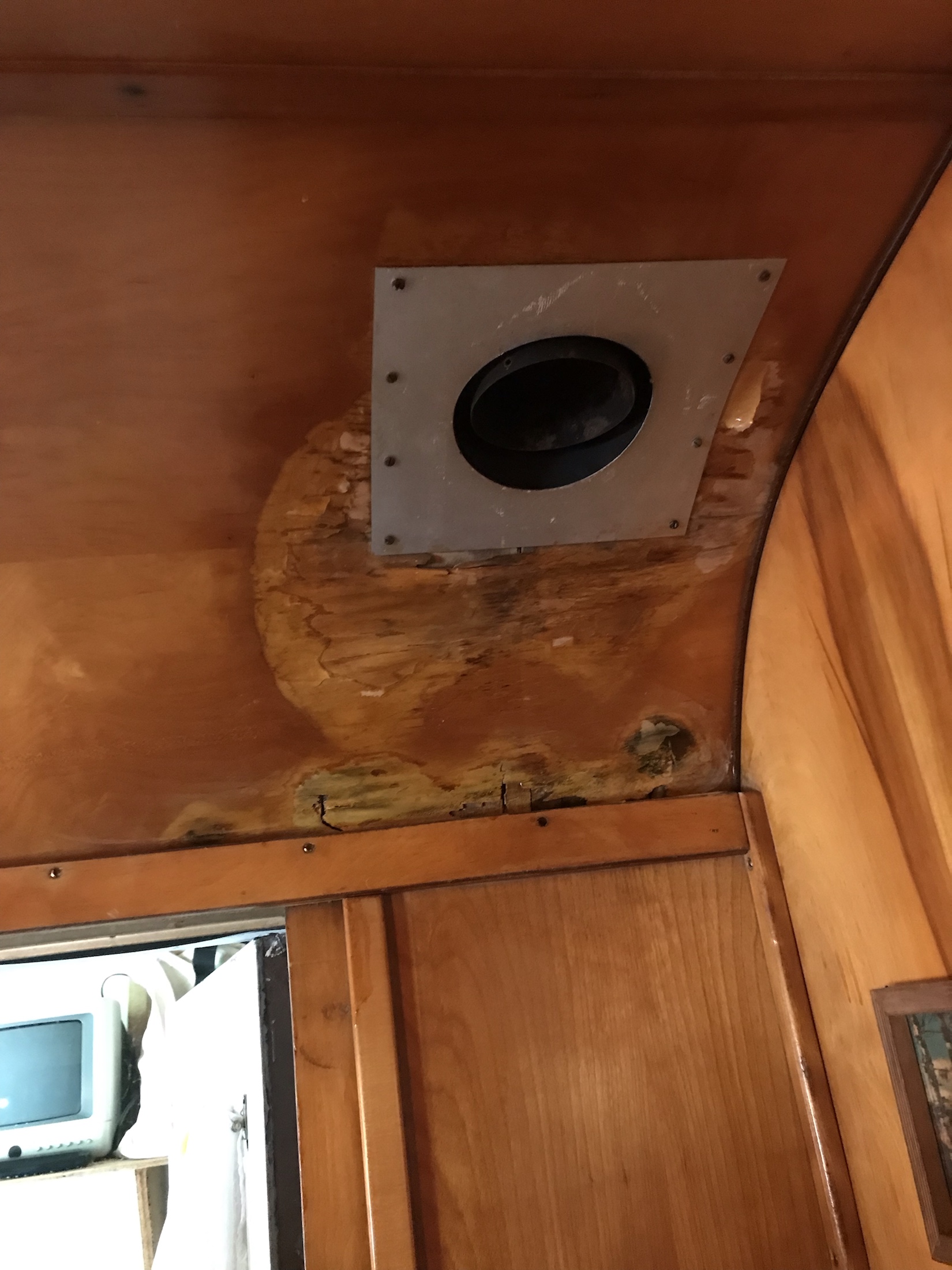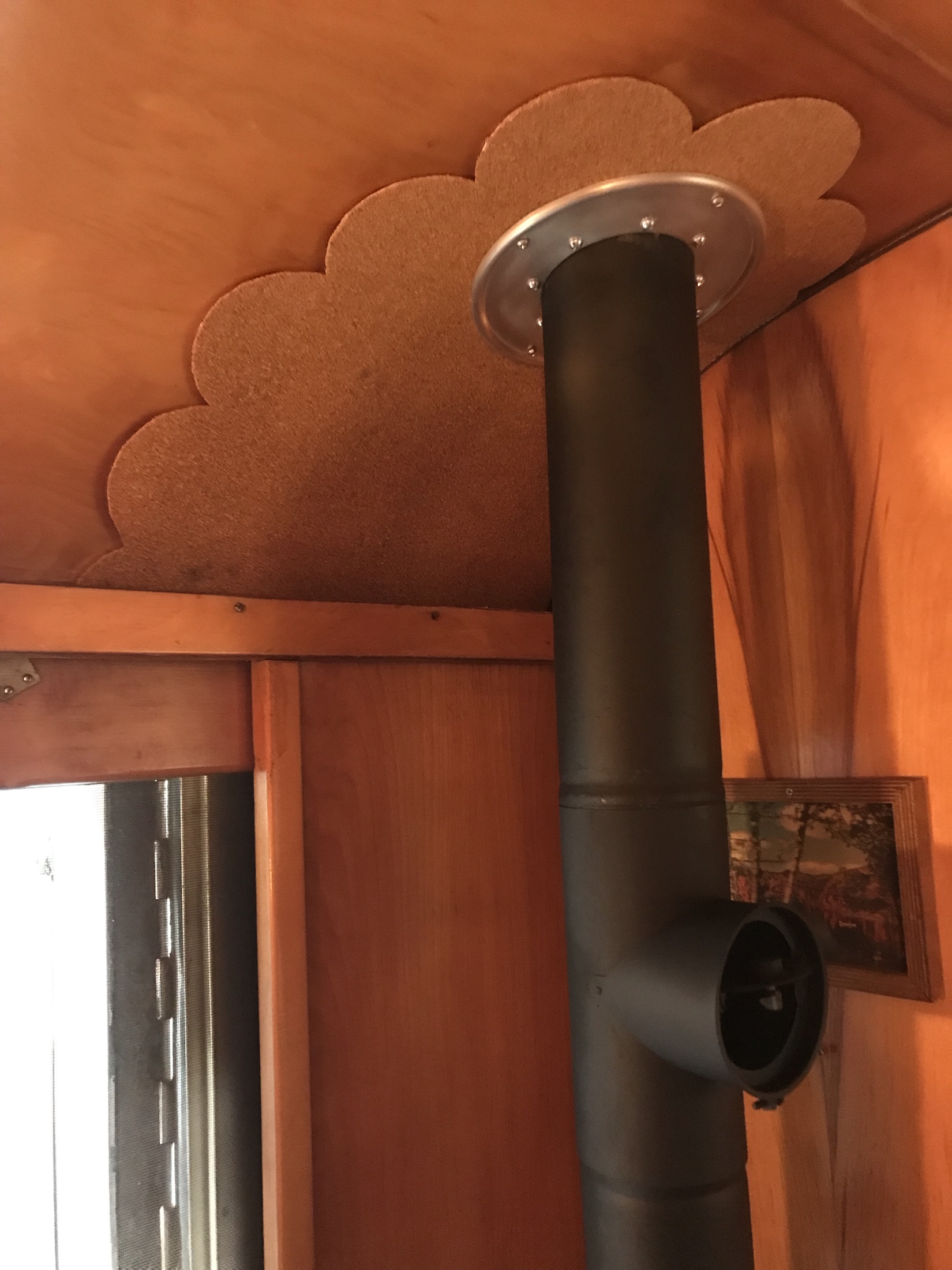 The Duotherm housing is screwed to the riser. Then it is ziptied thru the wall opening to the hanger bolts at the top of the cut opening. It’s very secure but remember it’s not holding anything else in place, just the lightweight metal housing. To conceal the top of the portable ac I painted the silver parts flat black. I used a piece of metal screening painted black to protect small items that might be dropped in, and it also supports the chimney pipe. The chimney pipe is also screwed to the ceiling but that’s a little sketchy with the usual rot so we shall see. I used a piece of cork to cover the rotted area. I like it but one of those things I’d do differently is I would extend the edge of the cork about 1/4″ past the plastic support that I used. You can see the white plastic edge. It only gets worse because EVERYONE touches it when they come in. It’s really odd!
